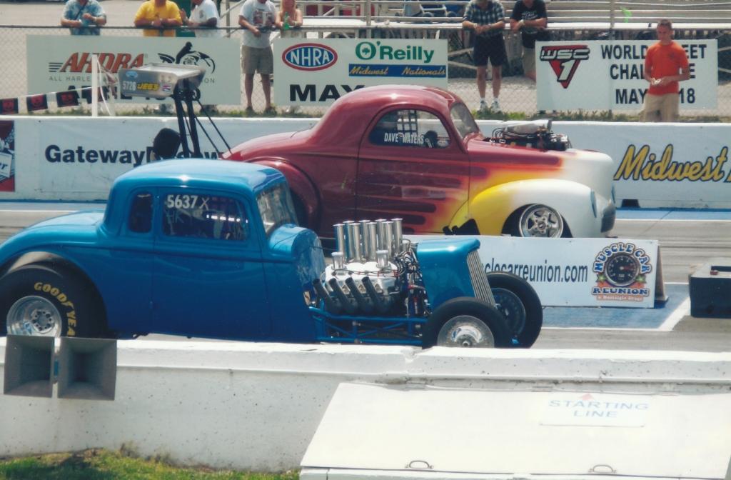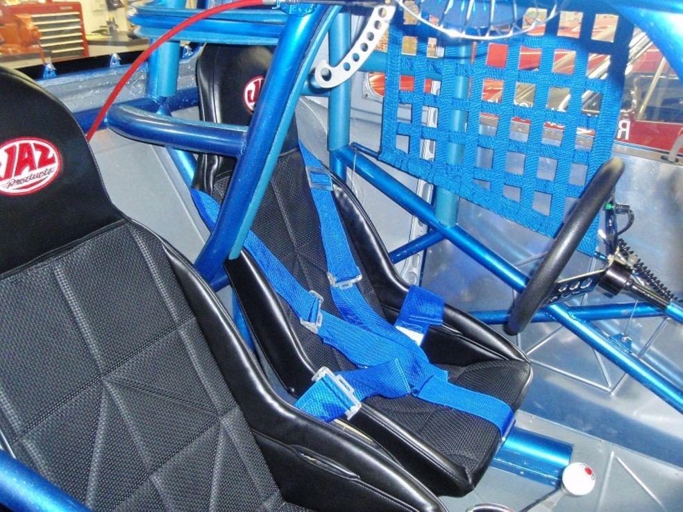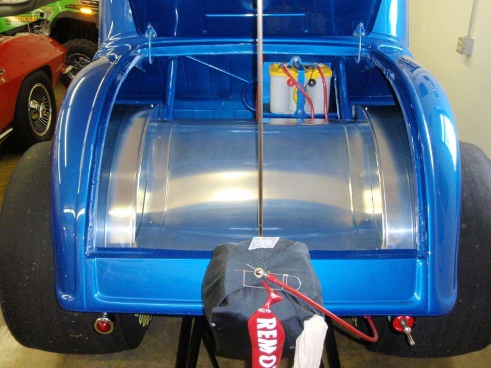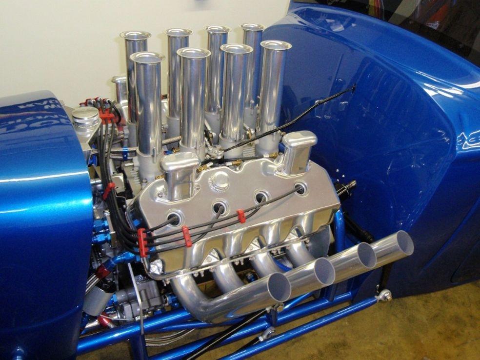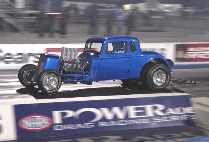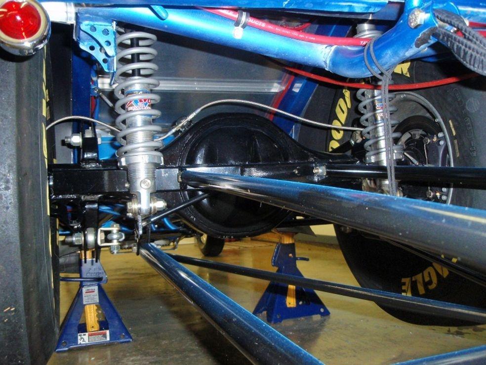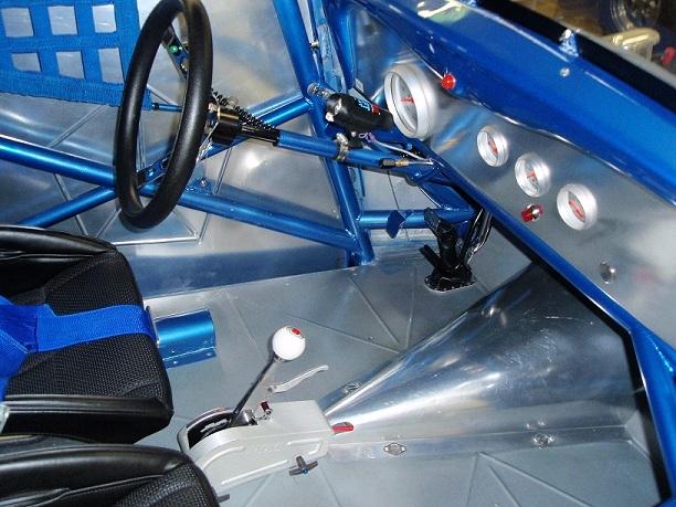 | Engine Engine Builder: AMT Racing Engines Manufacturer: Mopar Type: Chrysler HEMI Displacement: 472 cubic inches Induction: Hilborn Fuel Injection Heads: Keith Black single-plug aluminum 'fueler' heads, ported and polished with raised 'D' shaped exhaust port Block: NEW Mopar siamese-bore iron HEMI, Milodon head studs Main Caps: Stock HEMI 4-bolt with Milodon studs Crankshaft: NEW Mopar forged 4.15' stroke HEMI Connecting Rods: Eagle H-beam steel with ARP bolts Pistons: JE forged 12.5 to 1 Camshaft: Competition Cams .700" roller Valves: Ferrea stainless-steel Valve Train: Indy roller-rockers and shafts, KB aluminum stands Exhaust: Jet-hot coated Dan Olson zoomies, polished aluminum covers Milodon gear drive, ATI super damper, Milodon oiling system Fuel System Manufacturer: Custom-made aluminum Capacity: 5 gallons Fuel Pump: Hilborn mechanical Fuel Type: 110+ racing gas Oil/Water System Radiator: Griffin aluminum, electric fan Water Rad Location: behind grille Water Pump: Meziere electric Electrical System Ignition: MSD 7al box, Pro-billet distributor Alternator: Shogun Battery: Optima deep-cycle yellow top Transmission Manfacturer: Chrysler Type: Torqueflite Shifter: B&M Pro-Stick reverse pattern with Line-loc button Converter: Dynamic (Lupo) 9 inch, 5500 stall w/anti-balloon plates Trans Cooler: Perma-Cool aluminum Transbrake: A&A Transbrake valve body Pro-built trans with hardened mainshaft, aluminum drum, steel pump gear, Ultimate Sprag, etc. Rear End Manufacturer: Ford Type: 9-inch Ratio: 4.56 Richmond Case: Moser nodular iron Spool: Moser steel Axles: Moser 40-spline alloy Fully-braced, narrowed and powdercoated housing Body Construction: Original STEEL body and doors. 'Bear Claw' 2-stage door latches Color: 'Intense Blue' metallic pearlcoat Paint: Base coat/ clear coat Lexan windows, custom-made polished stainless-steel grille, radiused rear wheel openings Chassis Type: Full tube frame Builder: Jeffers Pro Cars Material: Chrome-moly and mild steel Finish: painted body color Certification: NHRA certified to 7.50 until 8/11 Front Suspension: 4-bar with chrome 6-inch drop tube axle Rear Suspension: Chassisworks 4-link with coil-overs, wishbone Shocks: Front-ProShock polished aluminum race type, Rear- AVO Aluma-Star coil-overs Brakes: Wilwood racing disc brakes, front & rear Steering: Funny car type Wheels: Polished Centerline Super-tricks Tires: Goodyear 15 X 33 slicks, Goodyear Front-runners Interior Color/Finish: Blue with silver accents & floor, black JAZ seats Material: aluminum door panels,steel floor Fire System: 5 lb. Fire bottle with emergency handle Restraints: RCI 5-point cam-lock harness, window net Guages: Autometer Ultra-Lite, Bickle switch panel Steering Wheel: removeable, padded 3 spoke with trans-brake button |