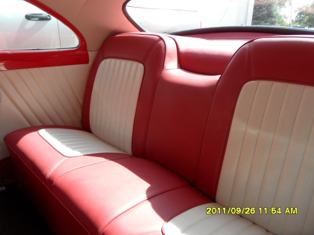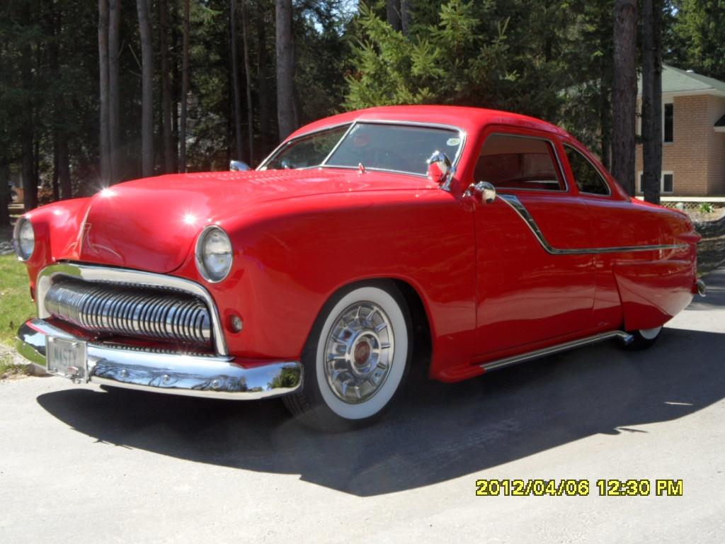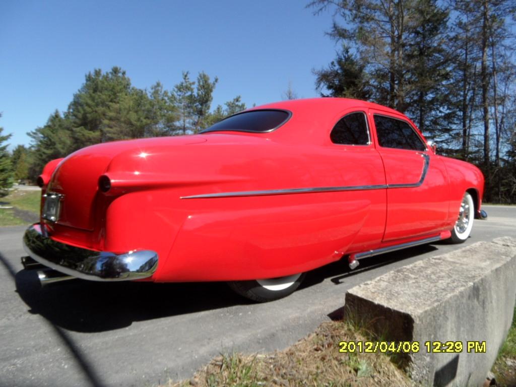 | Rare Canadaian only Coupe, chopped 2", B pillars leaned forward, rain gutter removed, body seems removed hood and door corners rounded, frenched headlights and tail lights, remote door openers, 1950 Mercury grill, 1955 Pontiac side body moldings, full length bubble skirts, 454 Cu. Chev. V-8 with 700-R-4 trans, 9" Ford rearend, disc brakes. Full custom interior based on 65 Chrysler 6-way power seats. |