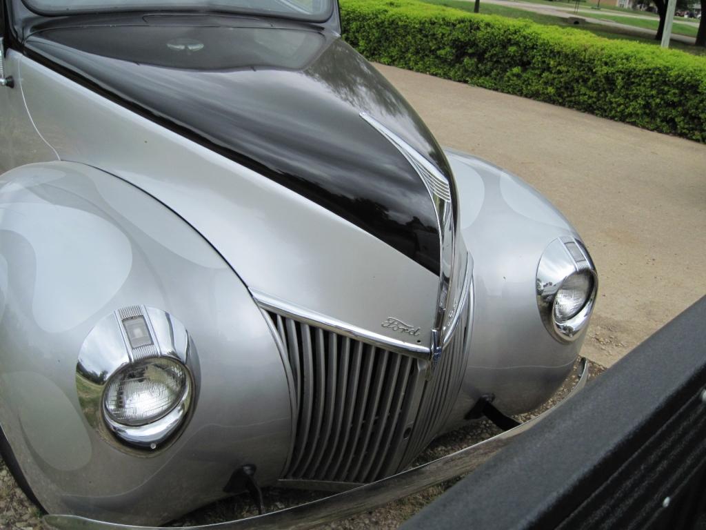 | A nice 39 ford 2 dr sedan. Black over silver with silver flames. Rolled and pleated gray and black cloth interior. Chrome wheels with baby moons. Camaro front clip, Camaro 10 bolt rear end. Power Brakes, 283 with 350. |