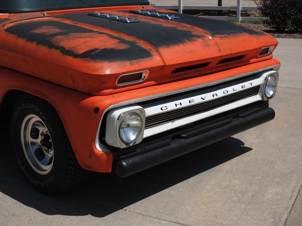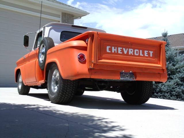 | 1965 Chevrolet C10 Pickup, Short Bed, Step Side, 350 SBC, Muncie M-21 Trans., 12 Bolt Rear, Rear Frame Mounted Gas Tank, Bed Widened (not fenders) 4 inches, Mini-tubbed, Custom Roll Pan, Custom Carrier For Fender Mount Spare, Radiused Rear Bed Rails, 1967 Camaro Dash, Front 4" Pipe Bumper, Stainless Tube Grill, Wheels: 15 x 8-1/2 Indy Alum. Slots Rear & 7 Western Alum. Slots Front, Tires: 33x12.5x15 Rear & 235-75-R15 Front, |