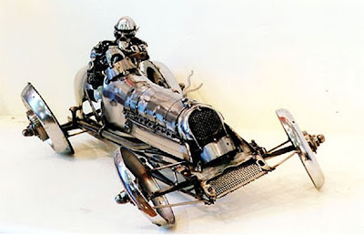 His sculptures are made of gears, spark plugs, exhaust, radiator, anything that the artist can achieve.