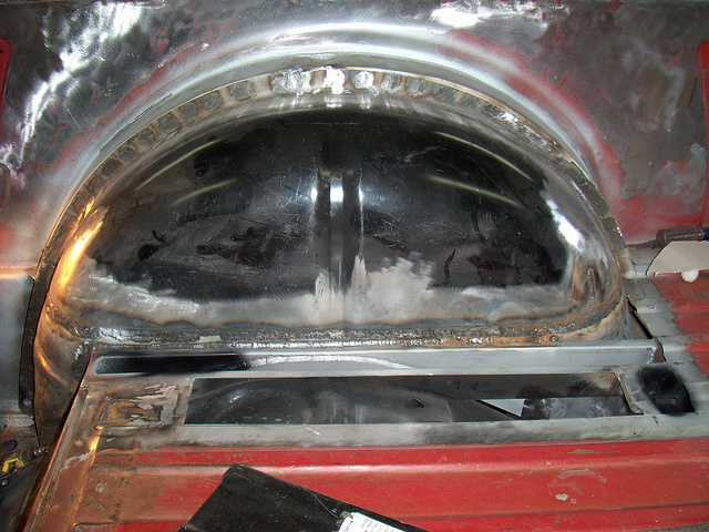 The previous owner had butchered the bed floor and cut the tubs out to get the 295's under it. We got a set of new wheel houses and added a section of 1X2 rectangular tubing, slitting it every 1/2" so it would flex and form to the tub flange. Looks somewhat factory. Heck of a lot of welding and griding to get another 2" of tire and wheel under it!· Date: · Views: 732